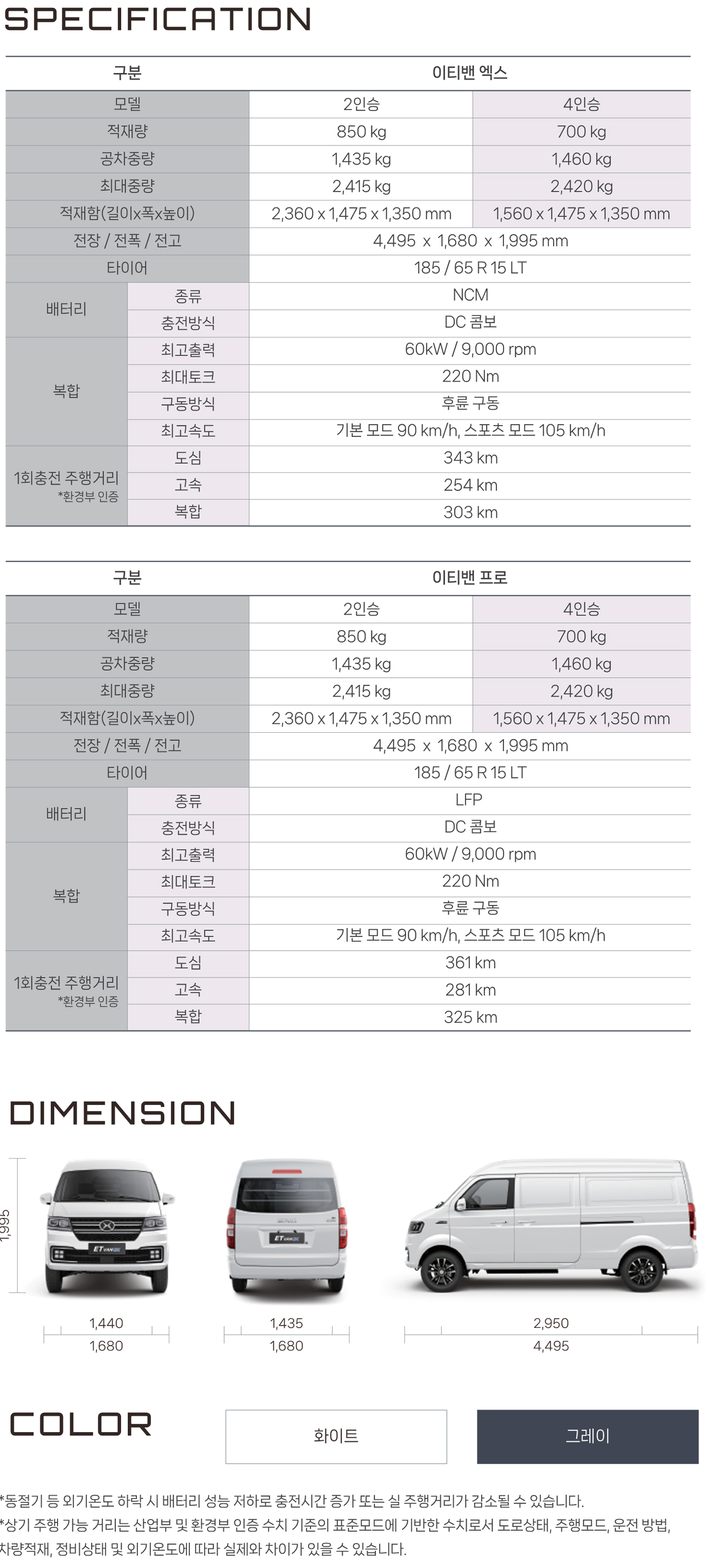2인승 : 2360 x 1475 x 1350 / 850kg