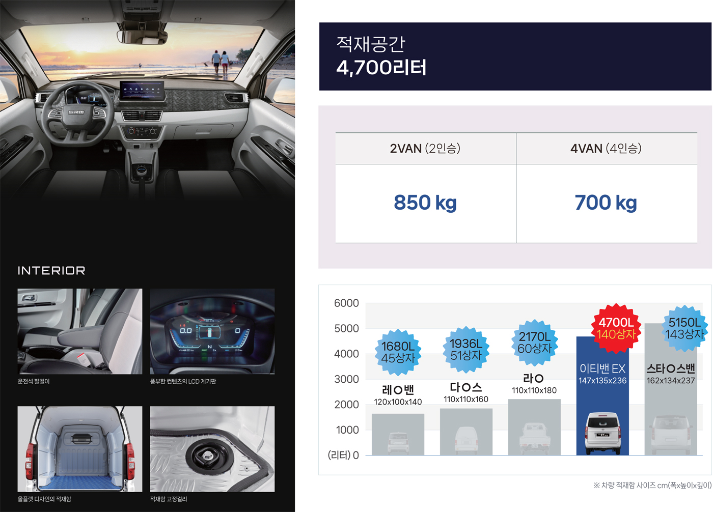 2인승 : 2360 x 1475 x 1350 / 850kg